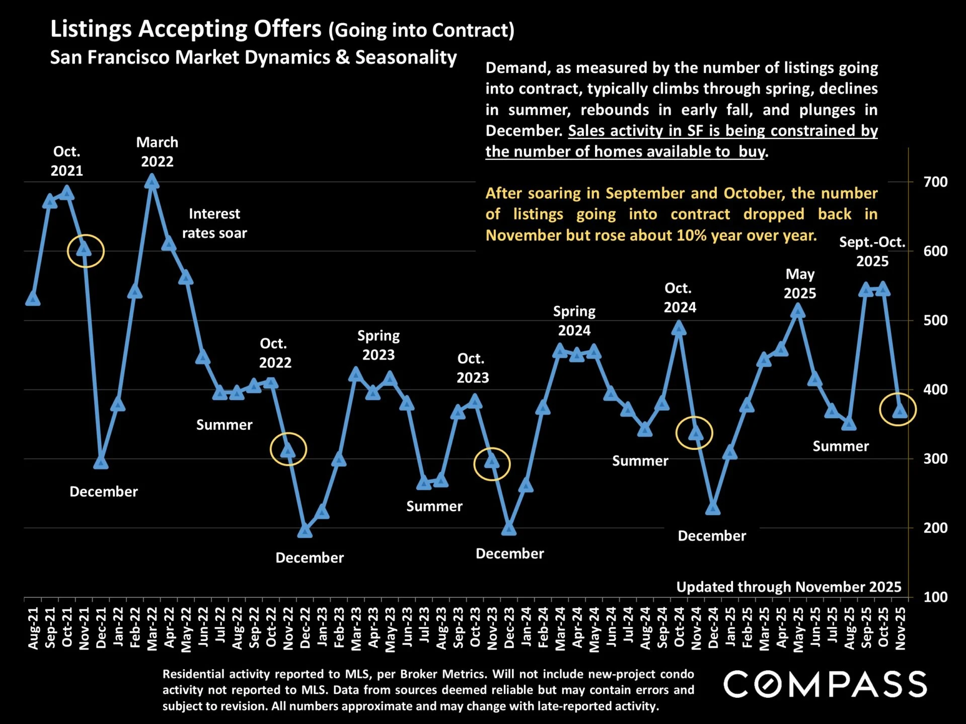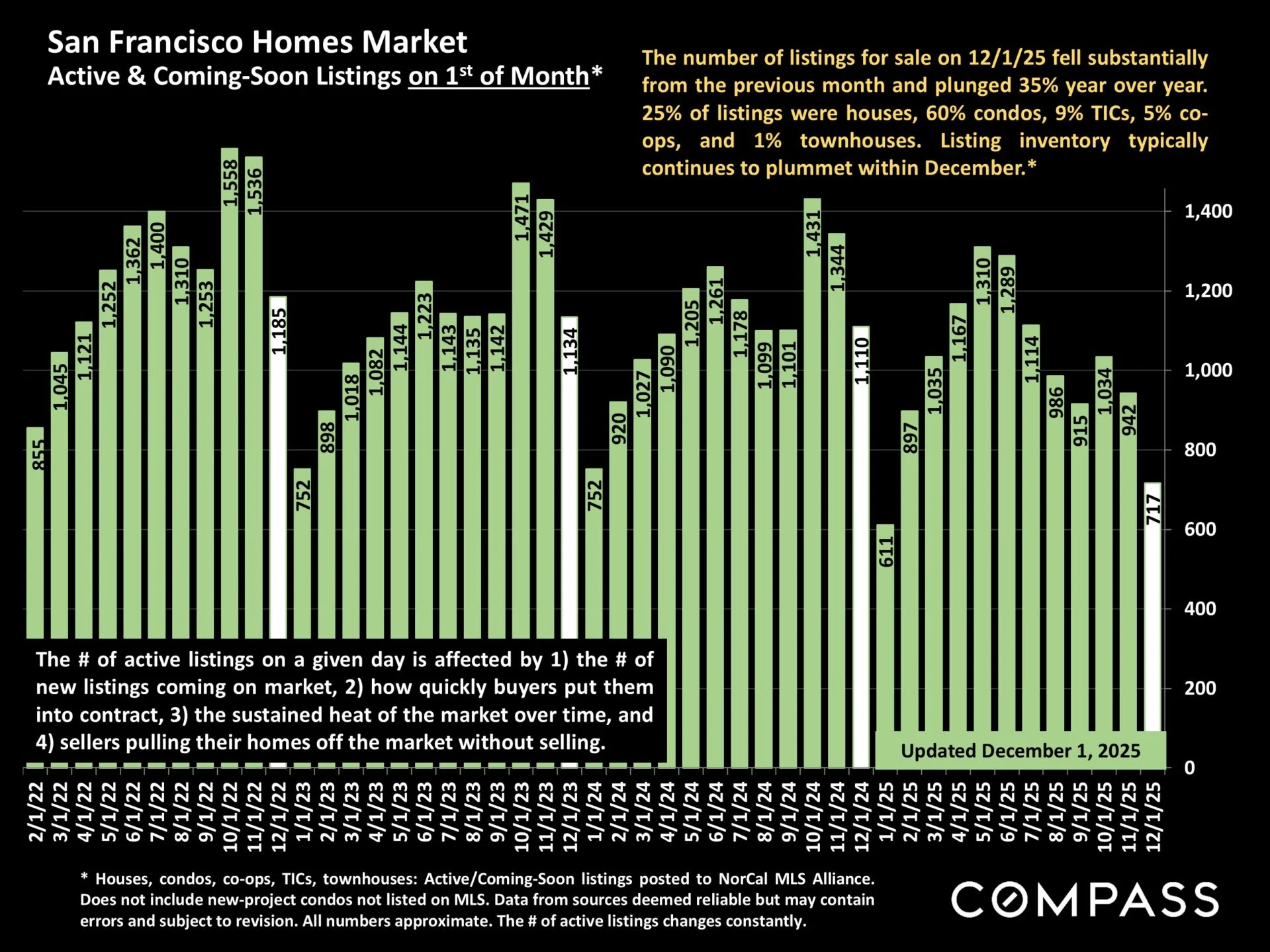 In the broader financial landscape, the first week of December saw the S&P 500 and Nasdaq largely recover from their substantial declines in November; and the 30-year mortgage rate was close to a 14-month low. While consumer confidence showed a modest rise from November, it remains very low by long-term standards – but this does not seem to be impacting the SF market. Attention is now focused on the Federal Reserve’s upcoming decision regarding an end-of-year benchmark-rate reduction, and the subsequent inflation report due later in the month.
