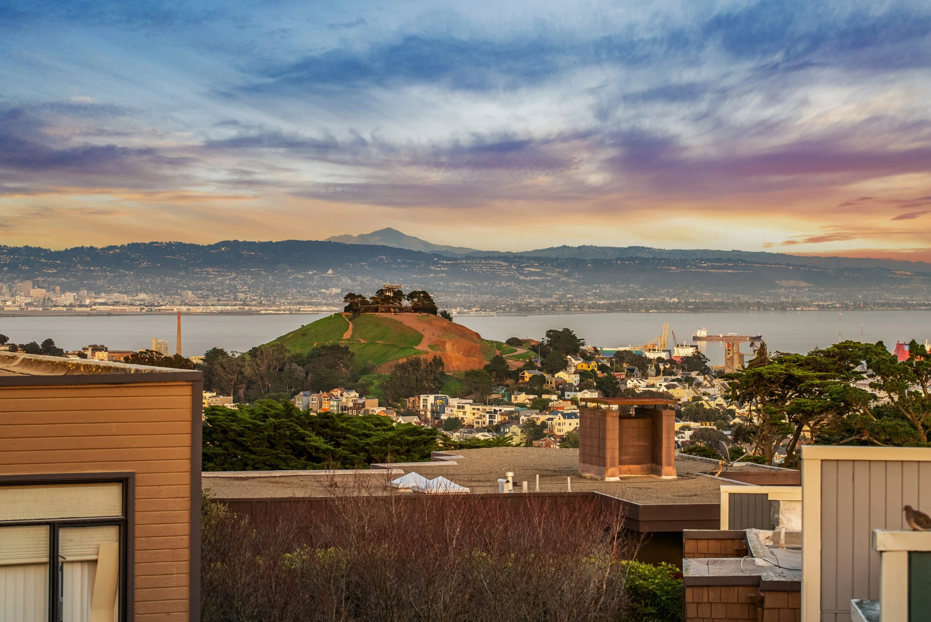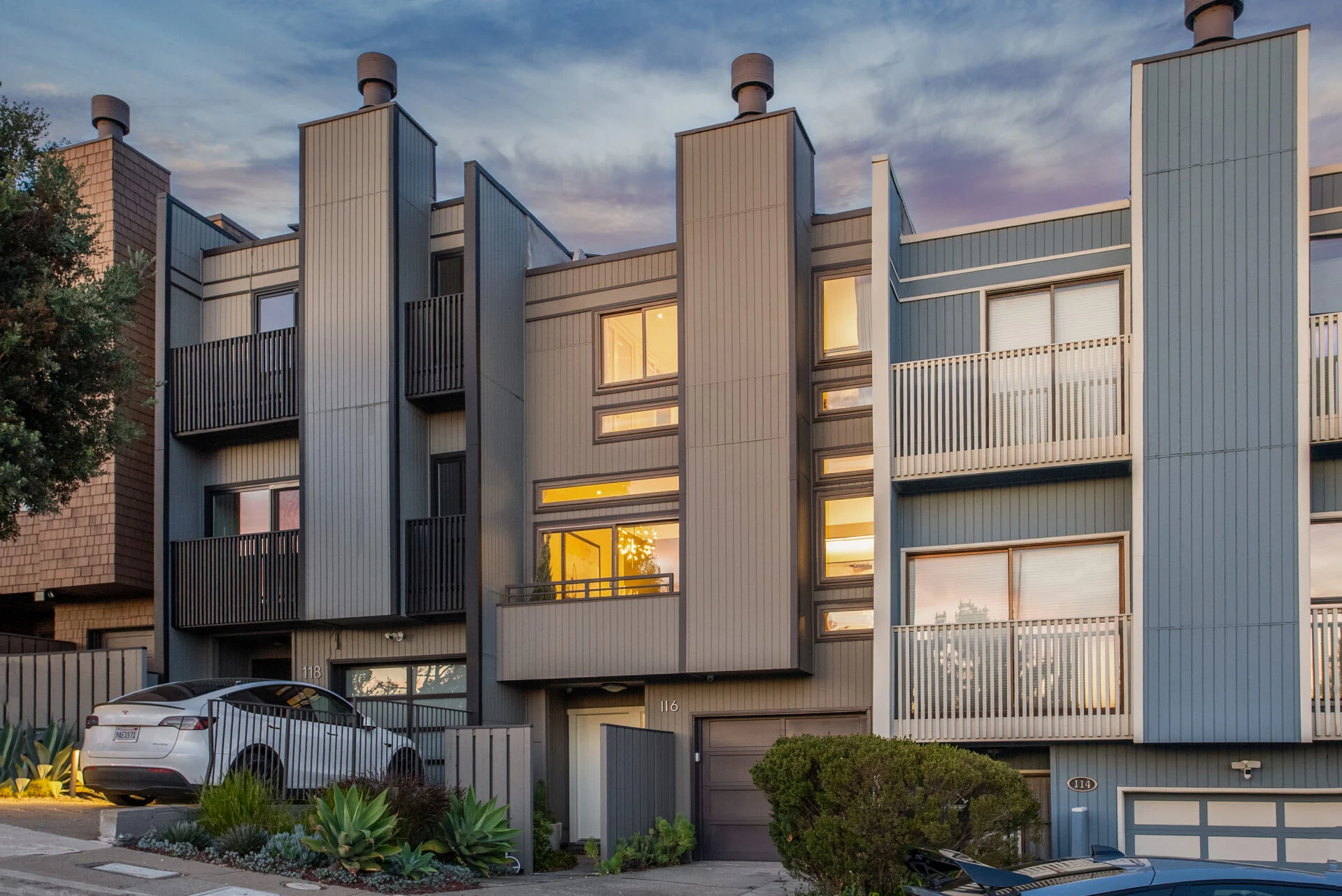 Designed by renowned architect Beverly Willis, this 2-bedroom, 2-bath townhome-style condo is a great single-family home alternative on the Glen Park border. Enter on the lower level, which features a private outdoor patio, ample storage, laundry, and 2-car parking (garage + driveway). Ascend to the main level, an open, sun-drenched space capturing panoramic views of the Bay and San Bruno Mountain. This area features a wood-burning fireplace, a renovated kitchen with Berkeley Mills cabinetry and Neolith surfaces, and a convenient full bathroom. Radiant heated floors in the kitchen and bathrooms ensure comfort. The upper level features two spacious bedrooms with stunning city and nature views, including one with a private balcony, along with a stylish full bathroom off the hallway. Automatic shades and a Sonos sound system enhance comfort and convenience. The home is also equipped with rooftop solar panels and is ideally located just moments from Billy Goat Hill, Walter Haas Park, Glen Park BART, and major freeways.
