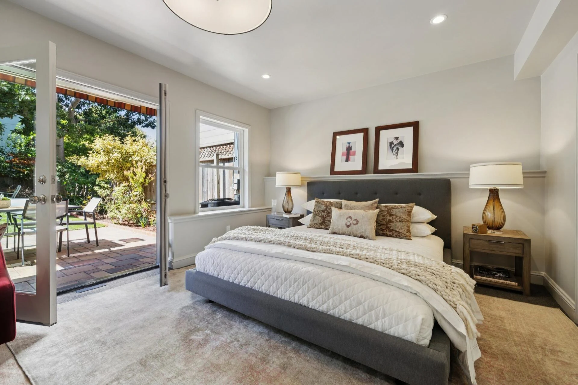 Descend to the lower level to find the spacious primary suite, a private and serene retreat. This well-appointed space features a large walk-in closet and an updated ensuite bathroom. French doors open directly onto the magnificent, landscaped garden—a rare and coveted amenity. This large, flat backyard, complete with a mature avocado tree, offers direct access from both the primary suite and a separate hallway, making it an incredible venue for outdoor dining and entertaining. A 2-car garage with direct interior entry and substantial storage space completes this level.