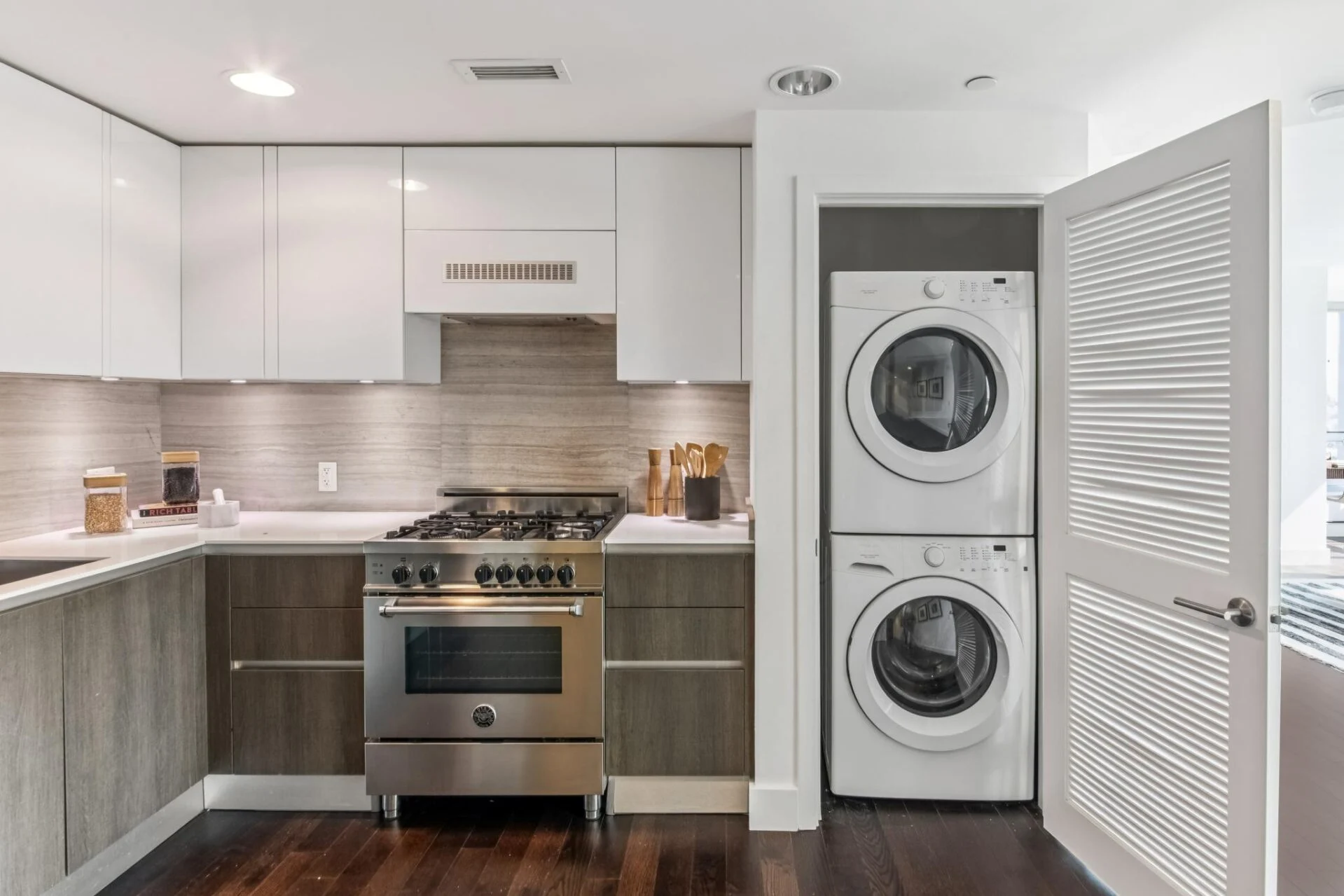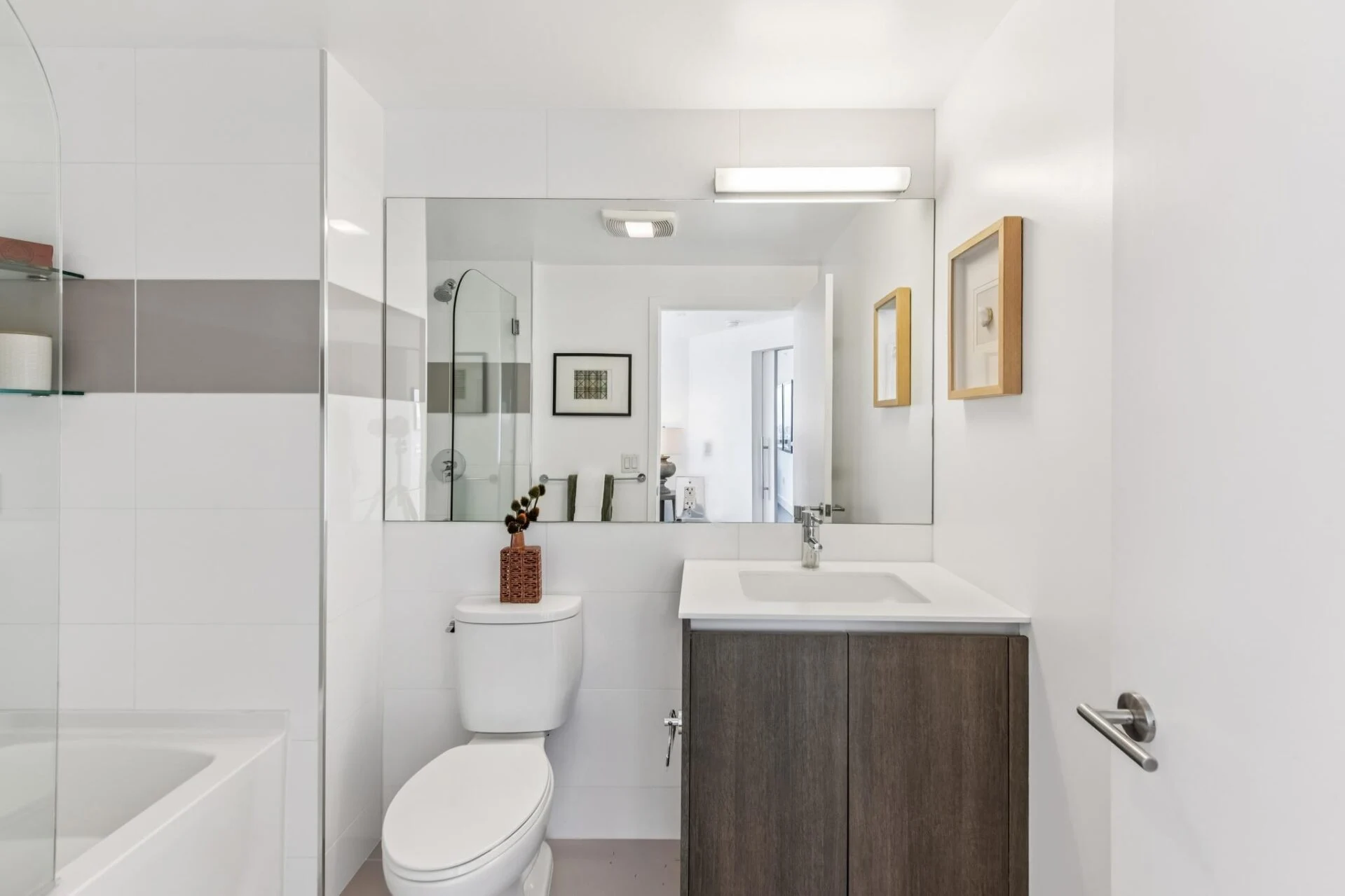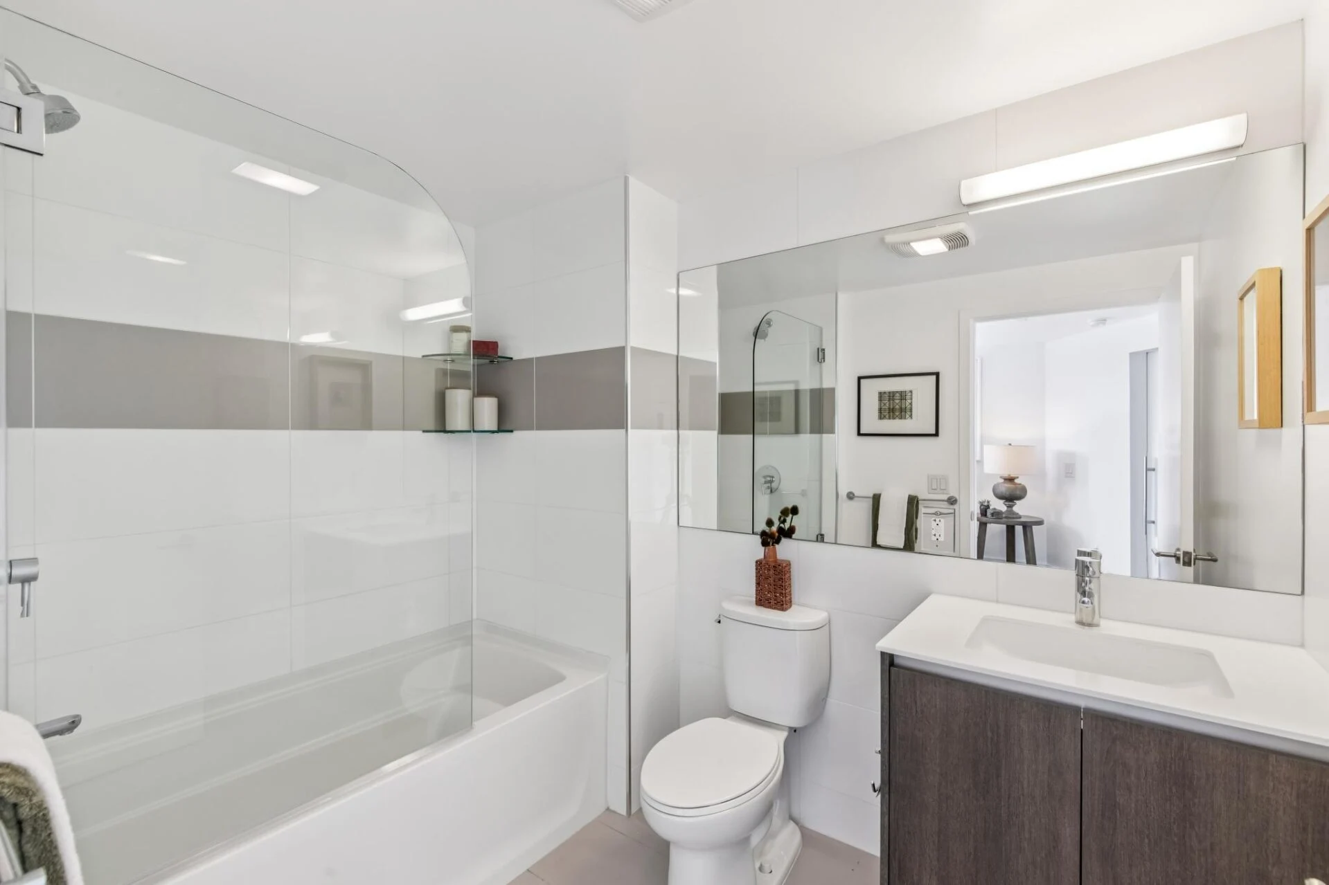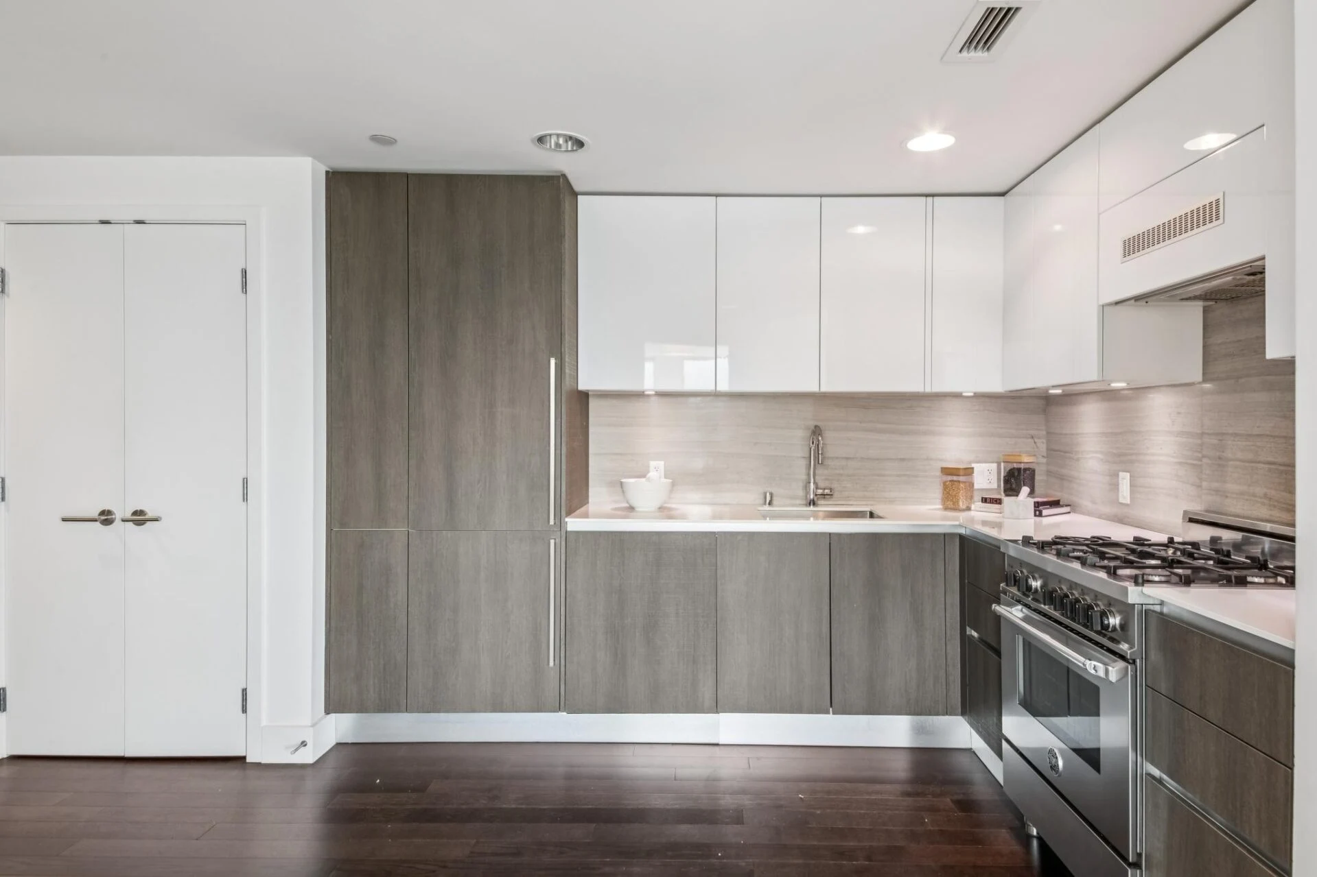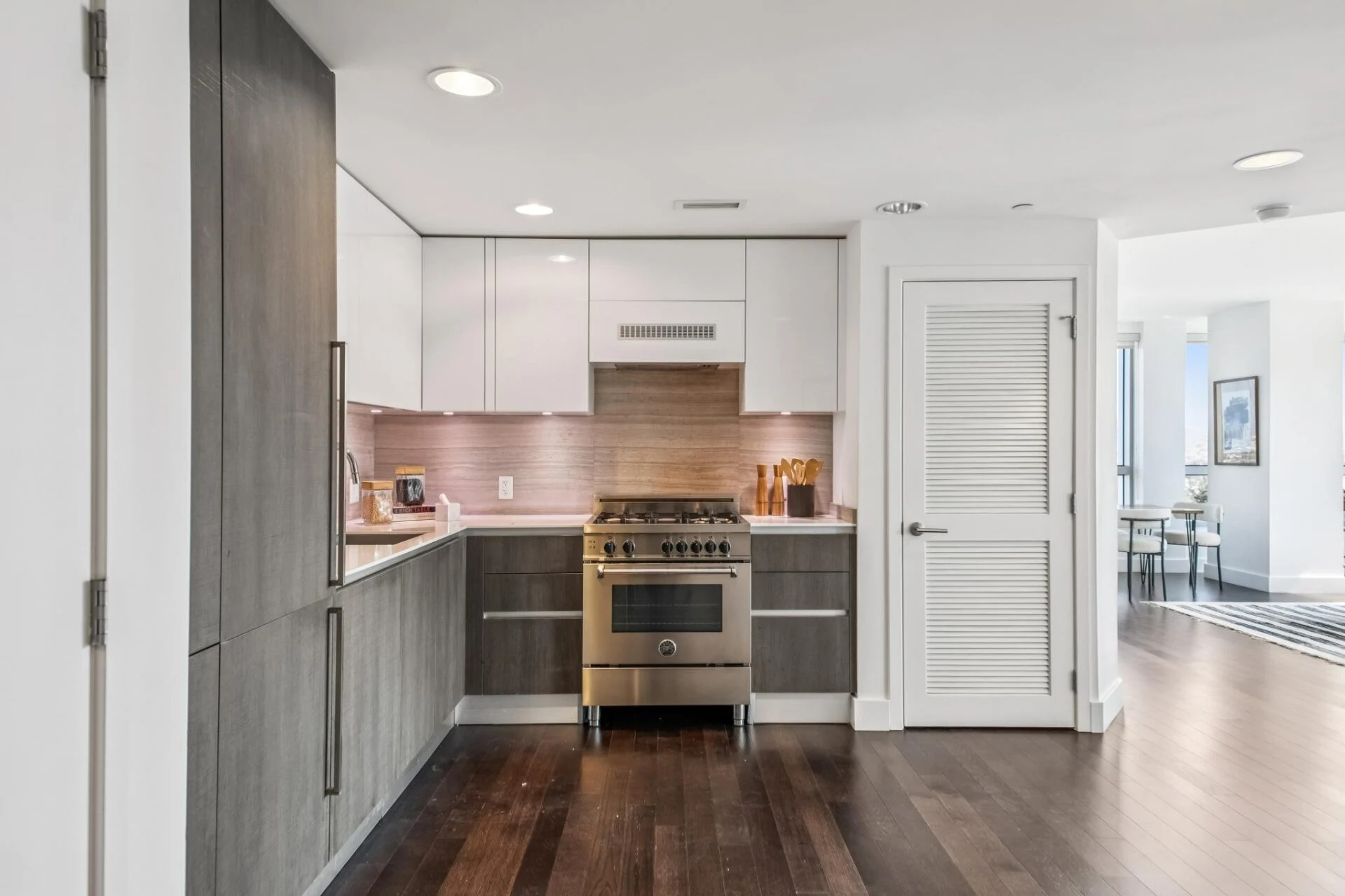 Inside, natural light floods the open floor plan, highlighting wood floors and a chic, streamlined kitchen with gas stovetop — ideal for hosting friends before a night out or enjoying a quiet dinner with the city twinkling beyond. One bedroom features a walk-in closet and spa-inspired en-suite bath, while the second bedroom flexes beautifully as a guest room, office, or creative space.