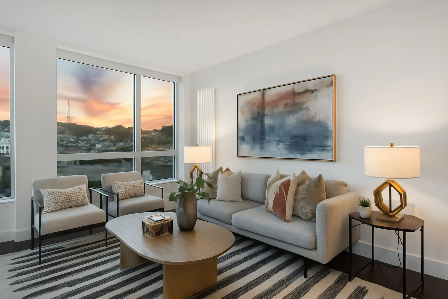Step into sleek city living in this modern 2-bedroom, 2-bath corner condo (1,185 sq. ft. per MLS) with floor-to-ceiling windows framing sweeping San Francisco skyline views. Built in 2014, this light-drenched home features an open floor plan, wood floors, and a stylish kitchen with gas stovetop — perfect for entertaining or quiet nights in. The primary suite offers a walk-in closet and en-suite bath, while the second bedroom is ideal for guests or a home office.